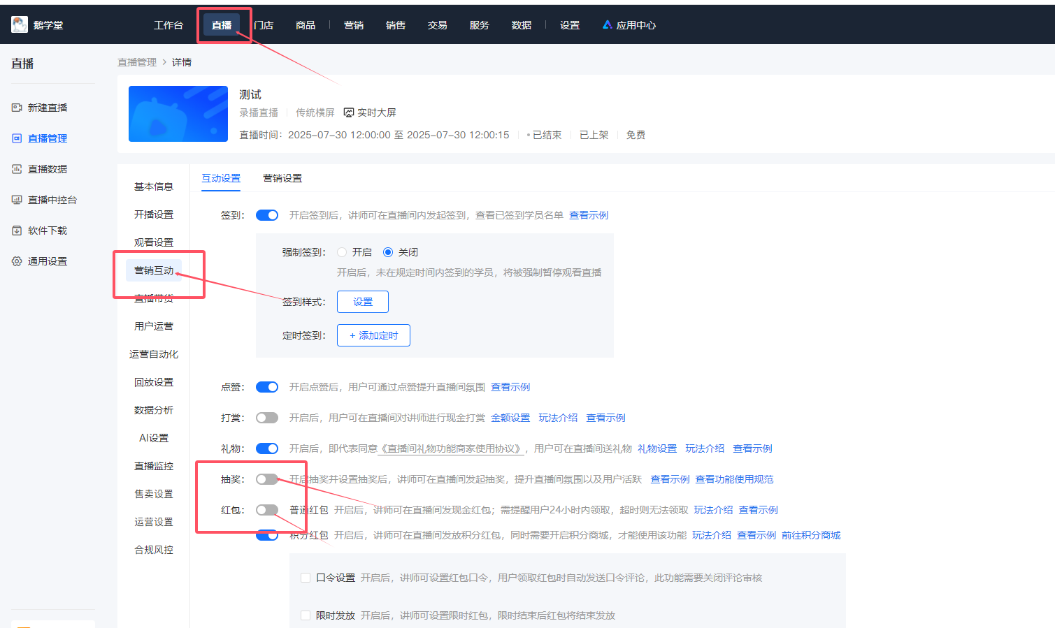 登陆小鹅通店铺管理后台,点击直播-直播管理,找到要设置的直播间(如果直播间没有创建需要先创建直播间),点击直播间管理进入直播间详情里面,直播间左侧导航选择营销互动-互动设置,开启抽奖并设置获奖奖品,开启红包并设置发放红包形式(普通红包还是积分红包)。