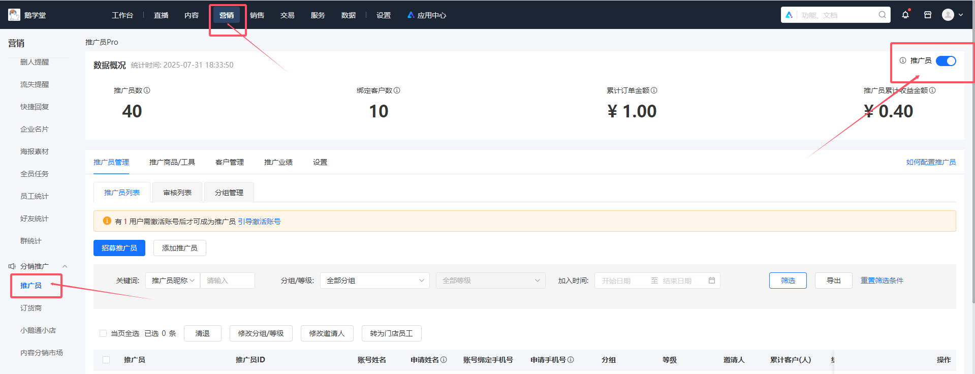 小鹅通店铺用户登陆自己的小鹅通店铺管理后台,点击头部导航里面的“营销”,然后侧边导航找到推广员,点击进入推广员管理里面,开启推广员功能,设置推广员招募规则和佣金比例,添加推广员推广商品就可以招募推广员去推广营销了